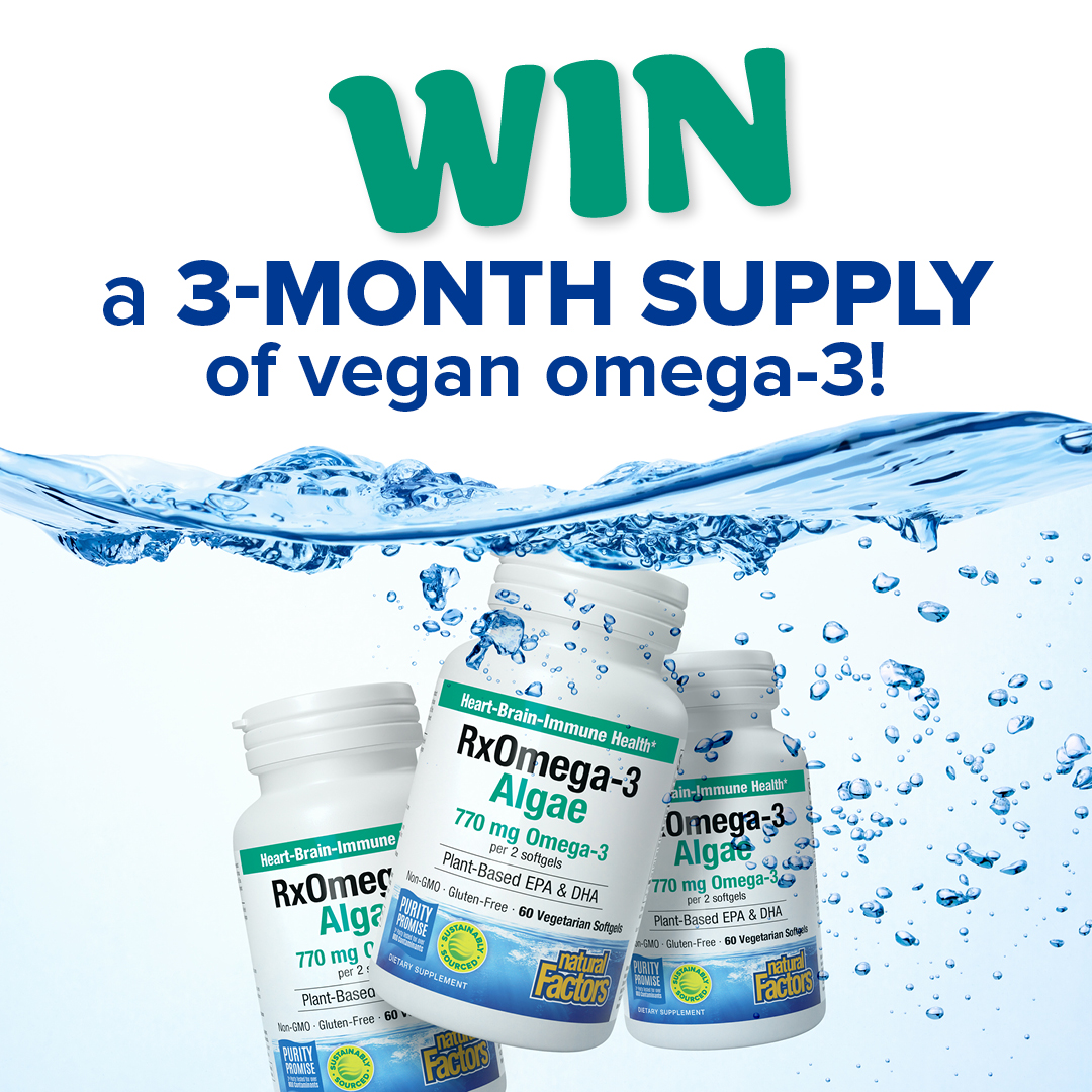 Enter for a chance to win a three-month supply of RxOmega-3 Algae from Natural Factors! It’s a clean, vegan way to get omega-3 essential fatty acids that help support brain, heart, joint, and immune health—and comes with plenty of benefits:
