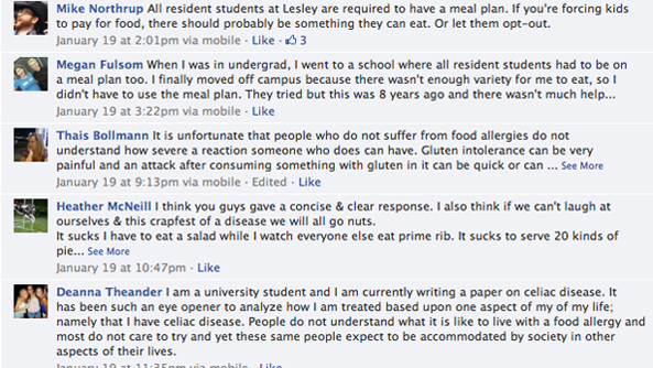 The Lesley case was prompted by students who objected to the school’s mandatory meal plan; when a student suffers from celiac disease or gluten intolerance, eating most traditionally prepared food results in severe and ongoing health problems.