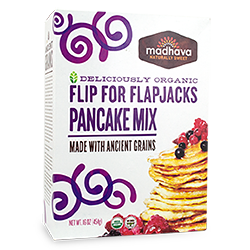 Vegan: Madhava Flip For Flapjacks Pancake Mix This better-for-you mix is filled with wholesome, USDA Organic and vegan ingredients, including wheat flour, spelt, cane sugar, coconut sugar and Kamut wheat. Just add water or a milk substitute for a quick, delicious stack. Top it with: Melt Organic Probiotic Buttery Spread; Now Real Food Organic Maple Syrup Grade B |