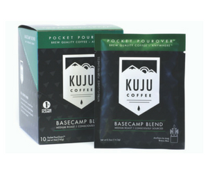 Kuju Coffee Pocket PourOver Basecamp BlendPerfect pour-over-style coffee becomes attainable while camping, fishing or traveling. Inside each handy pouch, you’ll find consciously sourced coffee and an innovative drip-style paper cylinder that clips over the mug rim. |