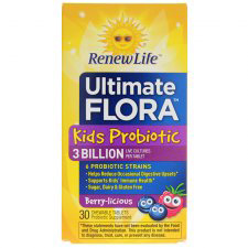 Ultimate Flora Kids contains six strains of probiotics, adding up to 3 billion CFUs in each chewable tablet. The specific strains are L. acidophilus, B. coagulans, B. lactis, B. breve, L. salivarius, and L. plantarum. The sweetener is xylitol.