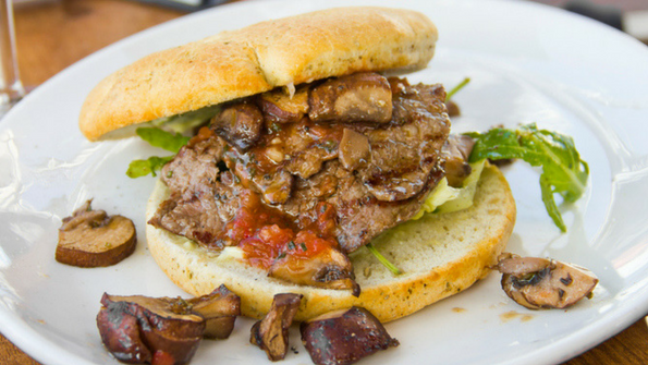 Bison Pitas with Spicy Red Pepper Sauce is a tasty sandwich that uses natural ingredients such as tomatoes, peppers, and feta cheese.