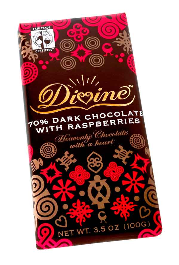 If you're going to give chocolate, make it a luscious fair-trade bar. This one bursts will tangy fresh raspberries.