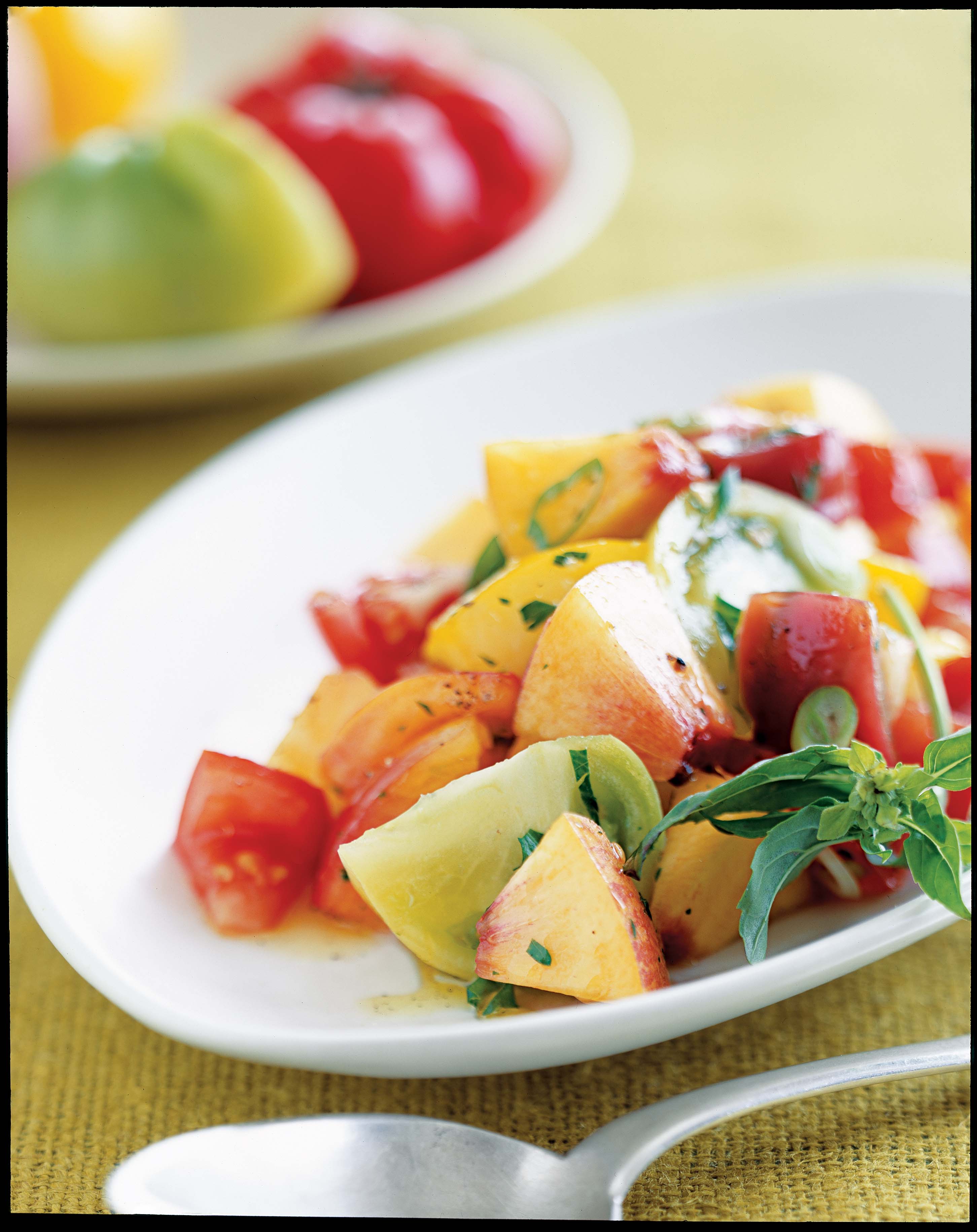 Serves 6–8 / These two fruits are wonderful combined, and they ripen in tandem only a month or so out of the whole year. Use multiple colors of heirloom tomatoes, including yellow tomatoes, to playfully confuse the eye because they are the same color as the peaches. Get the recipe.