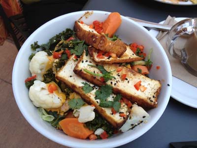 Seared tofu steak on top of steamed veggies, greens, and brown rice with a lemongrass and ginger coconut milk curry. This entree is gluten-free, too!