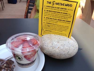 Vanilla cake layered with almond creme and fresh sliced organic strawberries. Plus a little of the Native Foods philosophy ... and a corner of the Double Delight Brownie (which I ate over the next few days), made with fair-trade cocoa.