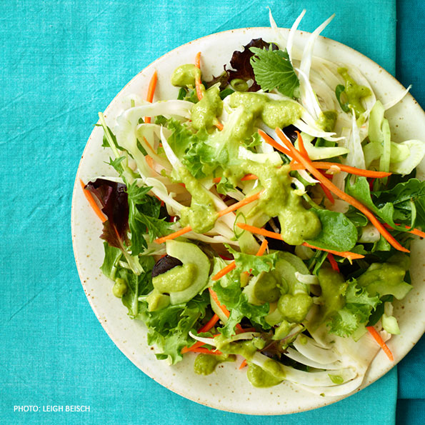 This is a flavorful, unusual salad made with fennel, a crisp, faintly licorice-flavored vegetable. The thick and tangy dressing also makes a great dip for crudités or sauce for steamed vegetables. View recipe.