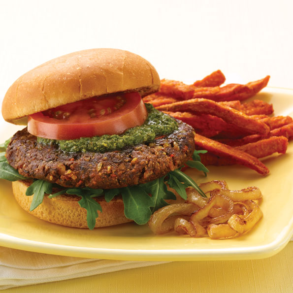 Possibly the best veggie burger we’ve ever had! Serve with sweet potato fries and your choice of pesto, horseradish aioli, melted cheese, goat cheese, caramelized onions, lettuce, and tomato. View recipe.