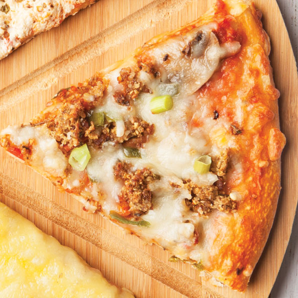 Peppered with mushrooms and a special meatless Italian “sausage,” this vegetarian delight contains only 5 grams saturated fat per serving (compared with double-digit saturated fat found in most sausage pizzas).