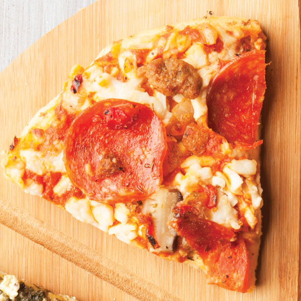 In our book, a gluten- and dairy-free pizza should taste just as good as a “normal” pizza. With uncured pepperoni, shiitake mushrooms, and vegan mozzarella cheese, this one satisfies.