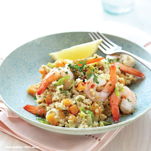 This rice-free risotto alternative lends itself to many variations; substitute leftover chicken for the shrimp, or leave out the shrimp and add frozen and thawed peas and cauliflower for a vegetarian rendition. Frozen squash is convenient, but of course you can use fresh squash cubes, steamed until tender. View recipe.