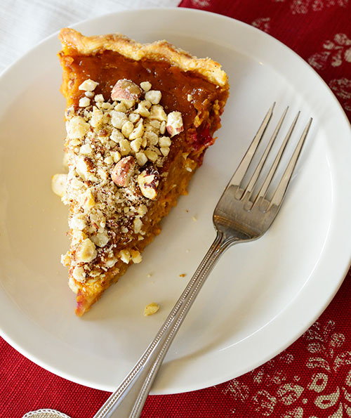 Studded with hazelnuts and brilliant cranberries, this is a colorful break from traditional pumpkin pie. Serve with a dollop of whipped cream and a cup of chilled eggnog. Get the recipe.