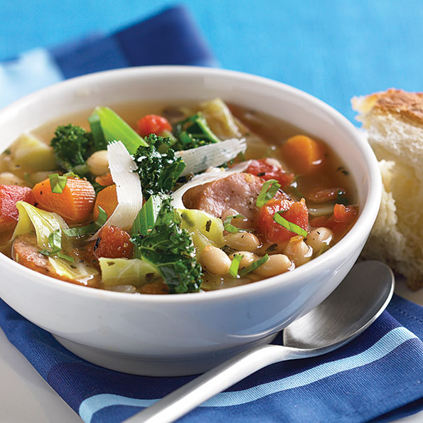 Ideal for a slow cooker. Simply toss everything together except the cabbage, kale, beans, and tomatoes; add those during the last 30-45 minutes of cooking. Serve with rustic bread. Get the recipe.