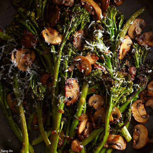 The broccolini tastes great at room temperature, so you can cook it ahead of time, or you can make the mushroom sauce while the vegetables are roasting. You can also substitute broccoli for the broccolini. Get the recipe.