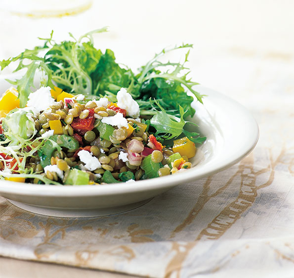 Plate this nutritious, protein-rich salad on a bed of lettuce, topped with feta cheese and olives and surrounded by tomato wedges and cucumber slices.