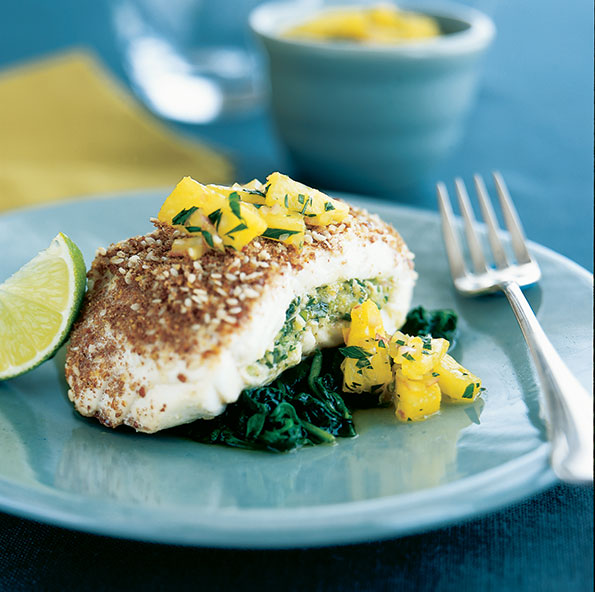 Delicate halibut, spicy ginger, a crunchy flaxseed-sesame topping, and a cool pineapple relish create a dish that’s beautiful, delicious, and full of anti-inflammatory nutrients.
