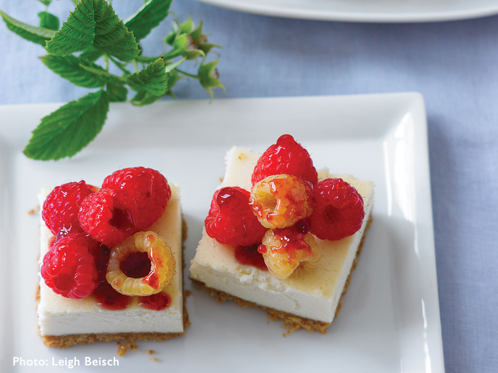 Perfect raspberries accent a reduced-fat cheesecake made with egg whites and Greek yogurt. Create party-worthy, bite-size petit fours by cutting into 1x1-inch squares and topping with a single berry.