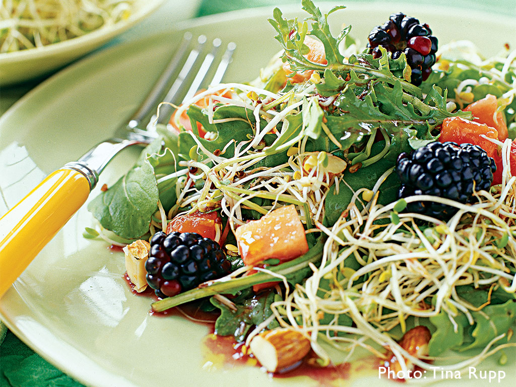 Broccoli Sprout and Arugula Salad with Blackberries, Papaya, and Almonds