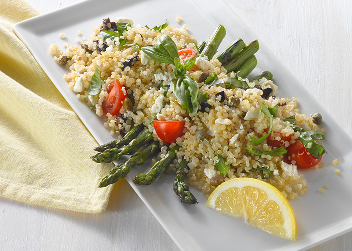 Asparagus is at its seasonal peak in April, so make the most of it! Roasting asparagus concentrates its flavor. If you don’t have quinoa, serve the asparagus atop brown rice or couscous, or simply as is.