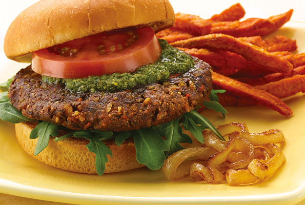 Possibly the best veggie burger we’ve ever had! Serve with sweet potato fries and your choice of pesto, horseradish aioli, melted cheese, goat cheese, caramelized onions, lettuce, and tomato.