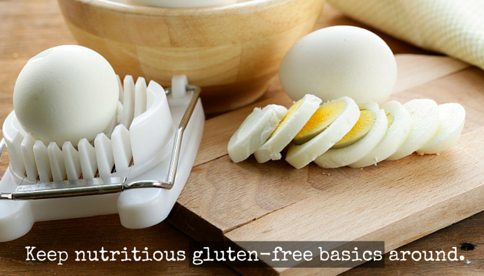 So you’re not caught in a pinch, be sure to always keep a few basic nutritious gluten-free items on hand in your kitchen. Eggs are a great example: gluten-free, nutritious, and versatile enough to be used for any meal, they also keep for several weeks. Hard boil a batch for snacks to take on the run.