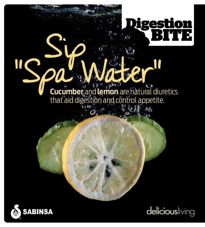 Bite-size tips for better digestion By Delicious Living | June 29, 2015 9/23 9. Sip on spa water. Sip on "spa water" to aid healthy digestion: cucumber + lemon + chilly H2O. So easy. Drink up! 0 comment 42 Facebook LinkedIn Twitter Pinterest Print