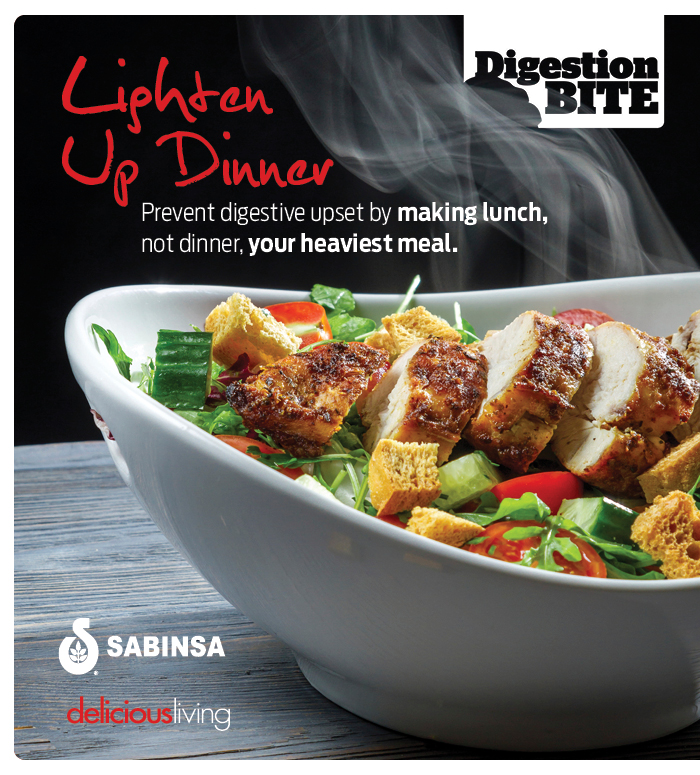 Bite-size tips for better digestion By Delicious Living | June 29, 2015 12/23 12. Lighten up dinner. Lunch, not dinner, should be your heaviest meal if you want to avoid digestive upset. 0 comment 42 Facebook LinkedIn Twitter Pinterest Print
