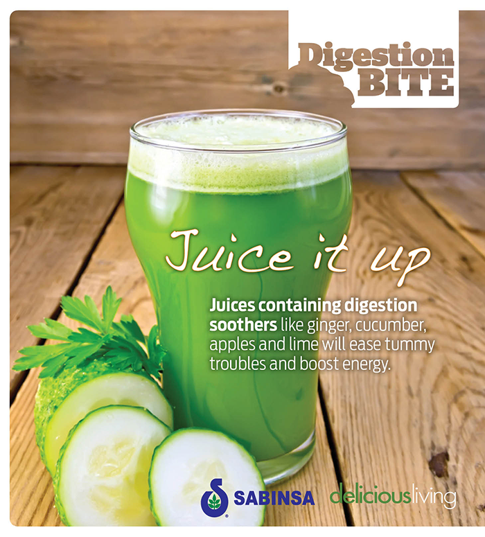 Bite-size tips for better digestion By Delicious Living | June 29, 2015 14/23 14. Juice it up. Add ginger, cucumbers, apples and lime to juices + smoothies to ease digestion and boost energy. 0 comment 42 Facebook LinkedIn Twitter Pinterest Print