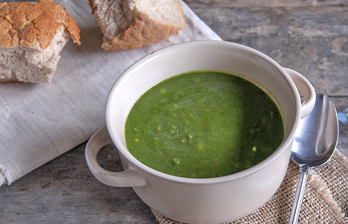 This recipe includes both broccoli tops and stems for maximum health benefit. The tops are slightly undercooked, preserving nutrients and their bright-green color. Garnish the soup with vegan Parmesan shreds, if desired.
