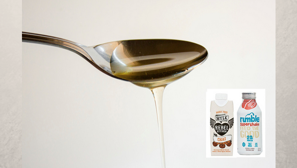 High fructose corn syrup is on its way out, and more natural sources of sugar are in—but blends of two or more sweeteners are the leading edge. You’ll see this in the Rumble Supershake, sweetened with organic maple syrup and organic agave, while Rebel Kitchen sweetens its coconut milk drinks with organic date nectar.