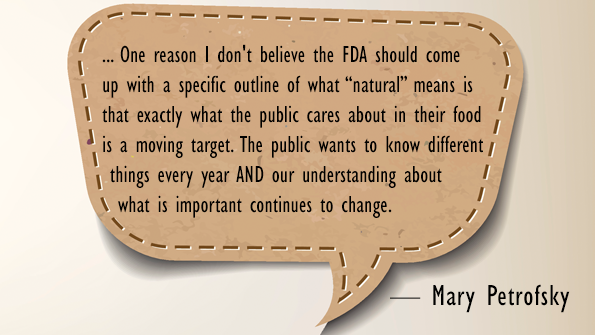 One reason I don't believe the FDA should come up with a specific outline of what "natural" means is that exactly what the public cares about in their food is a moving target. The public wants to know different things every year AND our understanding about what is important continues to change. For instance, if the FDA had come up with a definition of natural 20 years ago, it wouldn't have included anything about GMO or growth hormones because those weren't hot topics at the time.