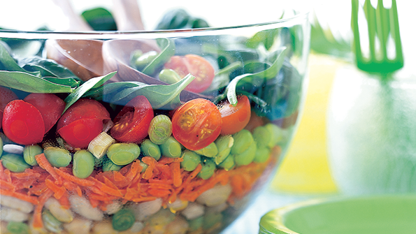 Assemble this a day early to let flavors marry. Make and serve in a clear plastic or glass container with a tight lid, so you can turn the dish over to distribute the dressing and so diners can see the colorful layers.