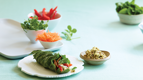 Take lettuce wraps to the next level with these gluten-free, vegan Swiss chard wraps stuffed with mashed avocado, almond cheese, sprouts and vibrant spring veggies.