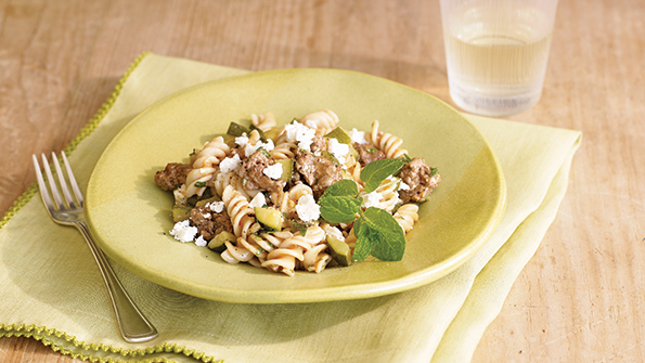 Skillet Brown Rice Fusilli with Lamb, Zucchini and Feta