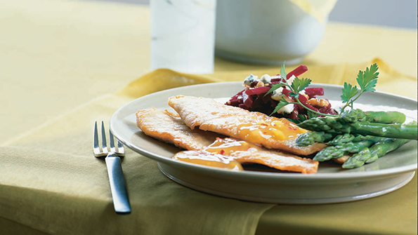 This is about as simple as it gets: fresh, thin-sliced beets get a coating of flavorful balsamic vinaigrette and garnish of walnuts and blue cheese.