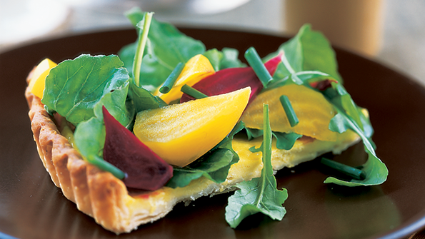 This is a unique way to serve beets that will help you appreciate the versatility of the nutritious root veggie. Simply fill a prebaked tart shell with a goat cheese and egg filling and bake. Finish the tart with a topping of marinated beets and greens.