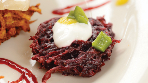 Traditionally made from potatoes, latkes make for a distinct breakfast experience but can also be served any time of the day. We season these with a mix of cumin, cinnamon, salt and pepper and top it with the classic dollop of Greek yogurt.
