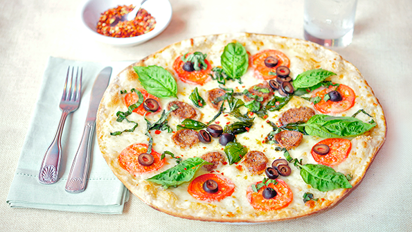 Use a premade whole-wheat crust to bring this fresh and filling pizza together in no time. Fontina cheese and flavored sausage really punch up the flavor, while fresh basil makes it just right for summer.
