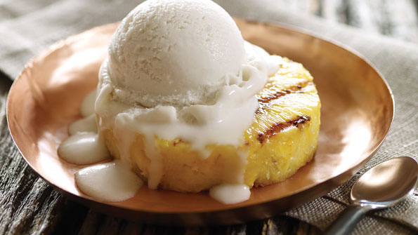 Coconut provides natural sweetness, greatly reducing the amount of sugar required to create the dairy-free ice cream that tops this tangy-sweet slice of grilled pineapple.