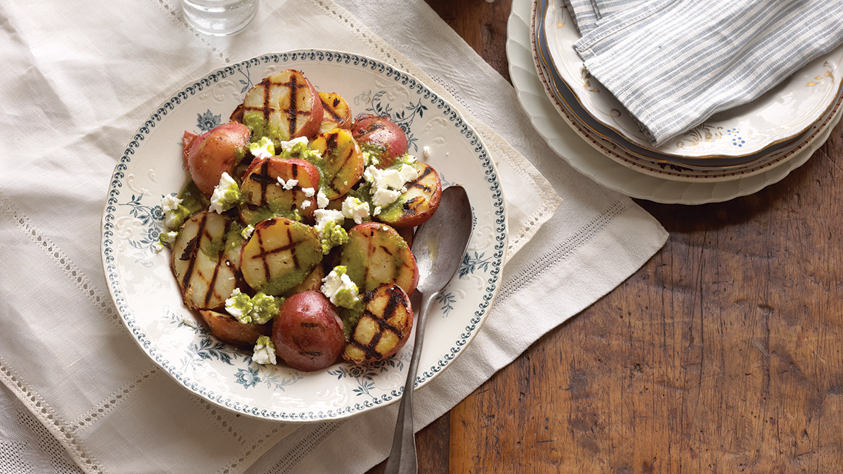 Grilled Potatoes with Chèvre and Cilantro Vinaigrette