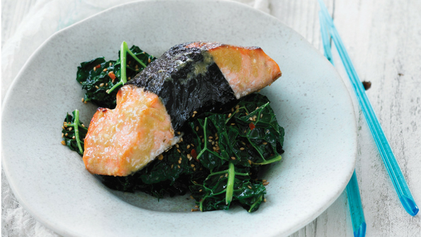 Nori-Wrapped Glazed Salmon with Sesame Kale
