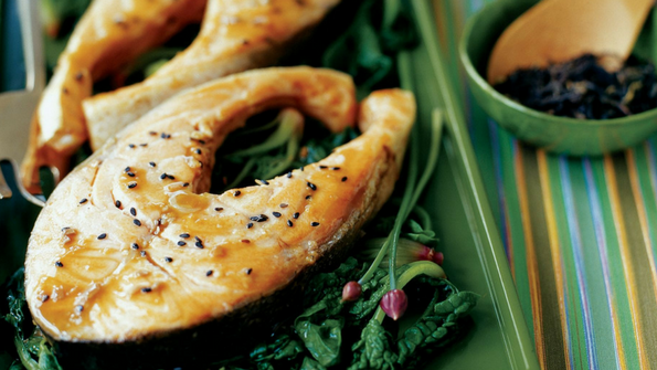 Infused with the delicate flavors of green tea, ginger, and sesame oil, salmon takes on an Asian flavor in this simple, colorful meal. Use loose-leaf tea for the richest flavor.