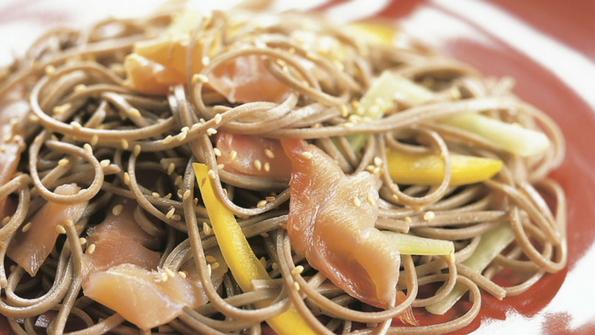 This Philippine-Chinese cuisine features cold noodles topped with stir-fried vegetables and fresh squid.