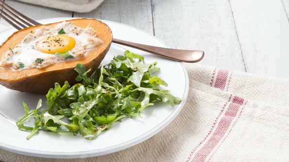 Tired of lox and bagels? Looking for a new take on hash? Try this baked sweet potato that features a depth of flavors: smoked salmon, cream cheese and egg, with a delicious salad on the side.