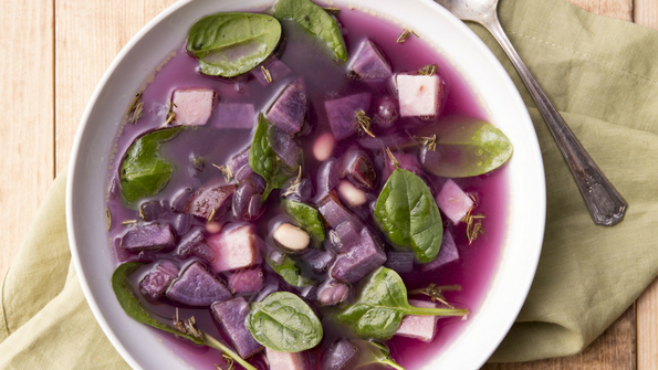 Don't adjust your screen. The purple potatoes in this White Bean & Purple Potato Soup with Ham add a fun hue to an easy but nourishing and filling dish. It's great for storing and reheating on cold days.