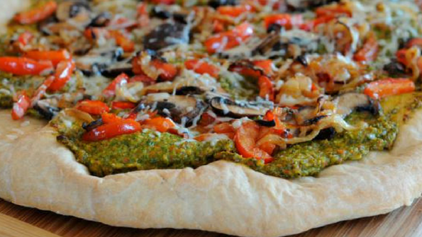Incorporating veggies is a great way to “healthy up” this family favorite. Use a veggie puree (such as tomato and sweet potato) or veggie-infused pesto, like the one here, as your sauce.