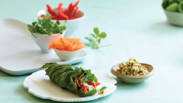 This may look complicated, but it’s truly quick and easy. Cut fresh Swiss chard leaves to make a vehicle for vitamin-rich ingredients, including bean sprouts, watercress and bell peppers.