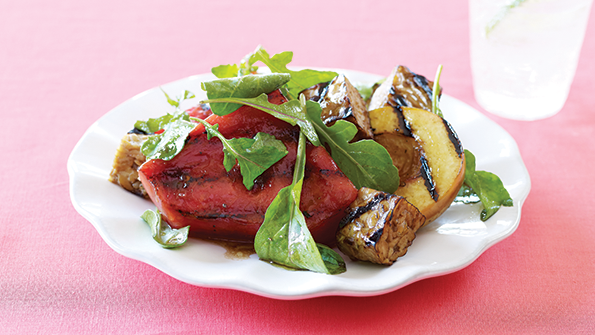 A ripe watermelon should sound hollow when tapped and have a dull (rather than shiny) exterior. If you purchase precut watermelon, look closely at the flesh; it should be firm, unblemished, and not overly grainy.Accompany this recipe with cracked wheat and couscous pilaf plus steamed sugar snap peas.