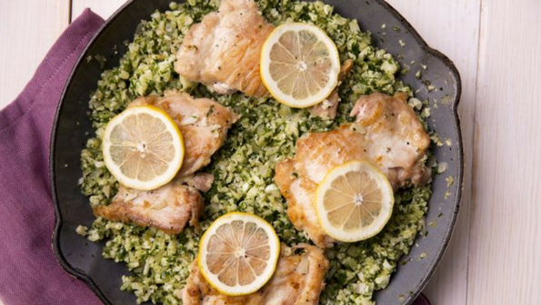 Hearty and tangy, this one-skillet Chicken with Pesto Cauliflower Rice is an easy recipe to whip up for a family dinner. Its ingredients are grocery staples, and are quick and easy to find.