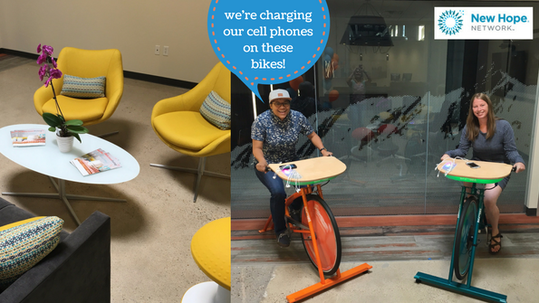 Our new building incorporates photovoltaic roof panels, as well as energy-saving mechanical, electrical and plumbing systems. Near the entrance, employees can charge their cell phones and other portable devices with leg power. A welcoming space greets guests.